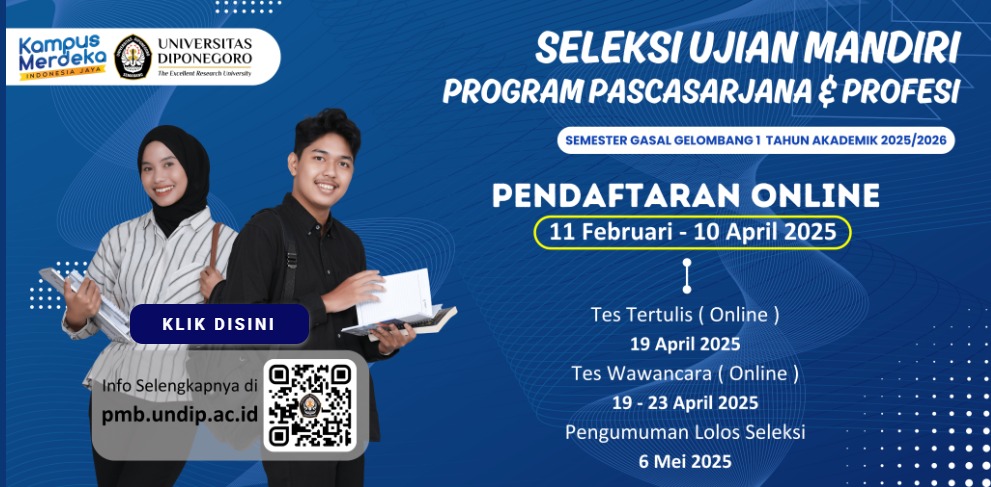 Universitas Diponegoro kembali membuka penerimaan mahasiswa baru untuk jenjang magister (S2), doktor (S3), dan program profesi melalui Ujian Mandiri Pascasarjana & Profesi. Inilah kesempatan bagi Anda untuk meningkatkan kompetensi akademik dan profesional di salah satu perguruan tinggi terbaik di Indonesia.